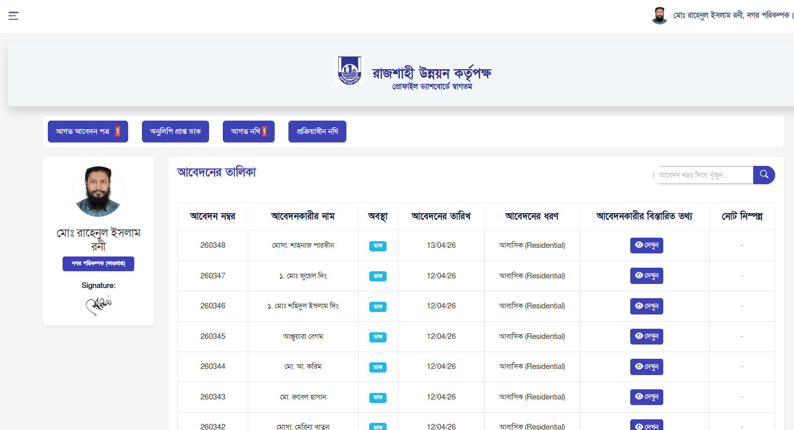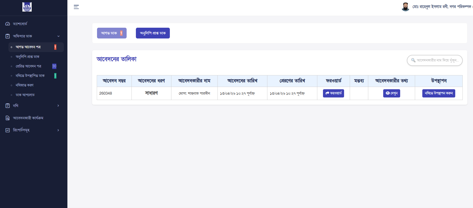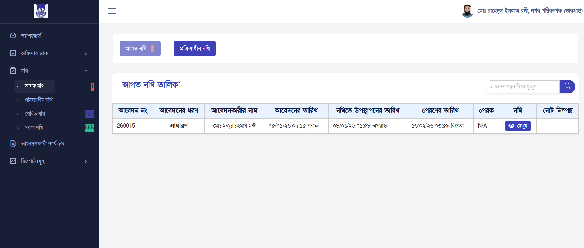 - Incoming Dak: Newly received applications from users